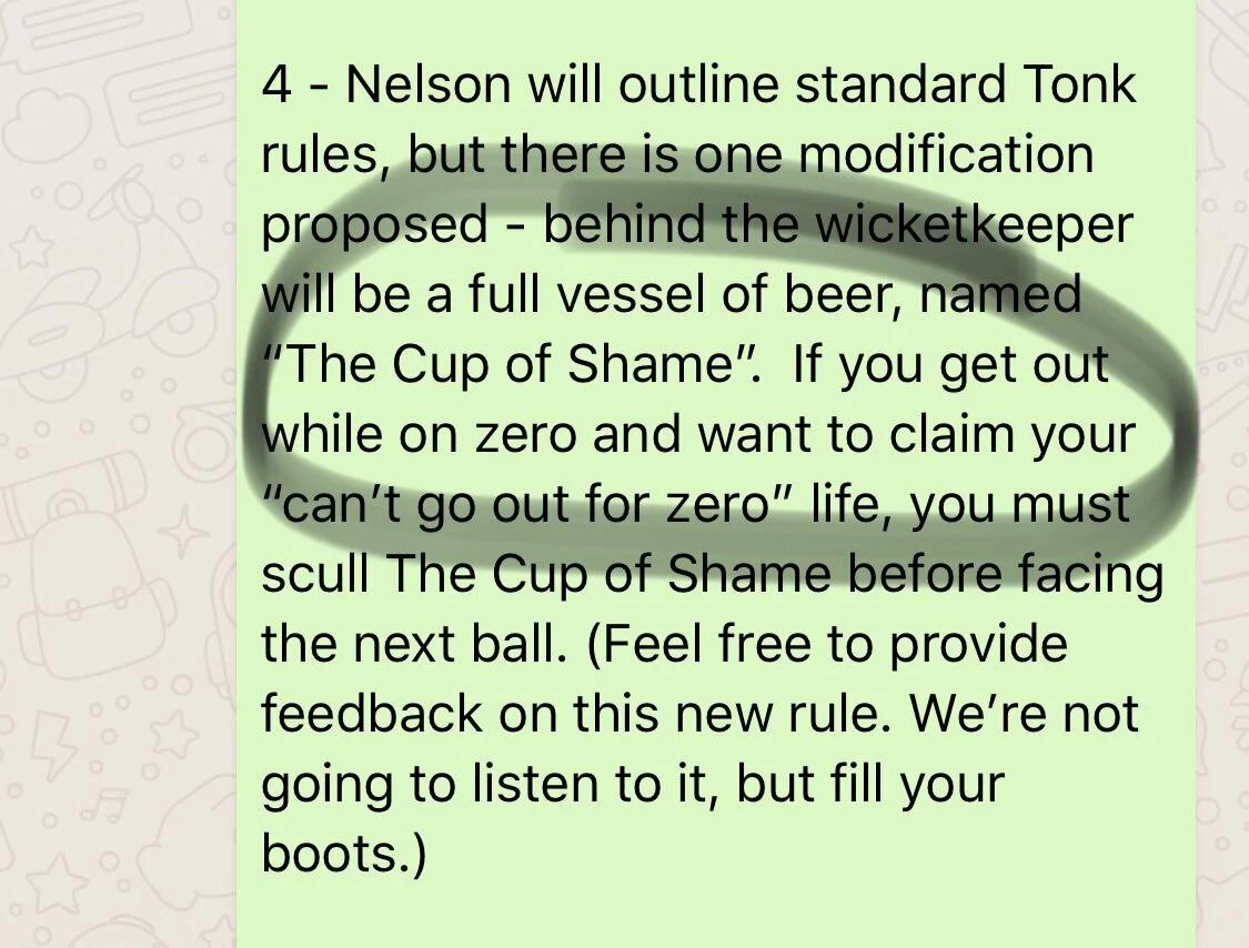 This year the controversial “Cup of Shame” rule came in - any batsman wishing to use the “can’t go out for zero” rule had to drink a full cup of beer / wine before being allowed to do so.