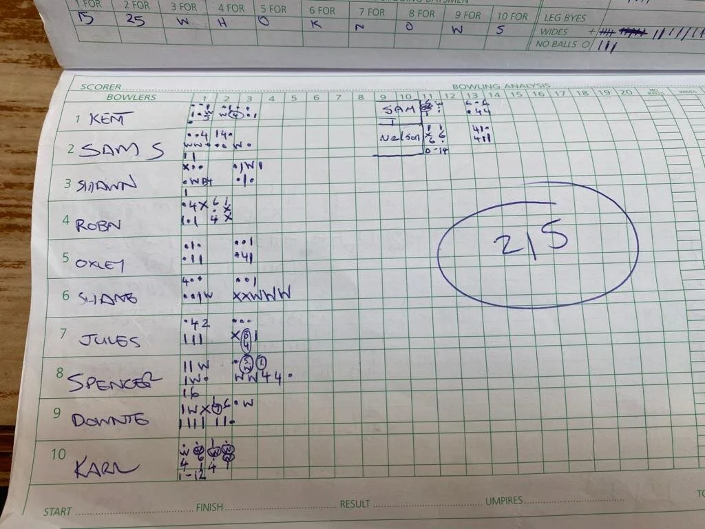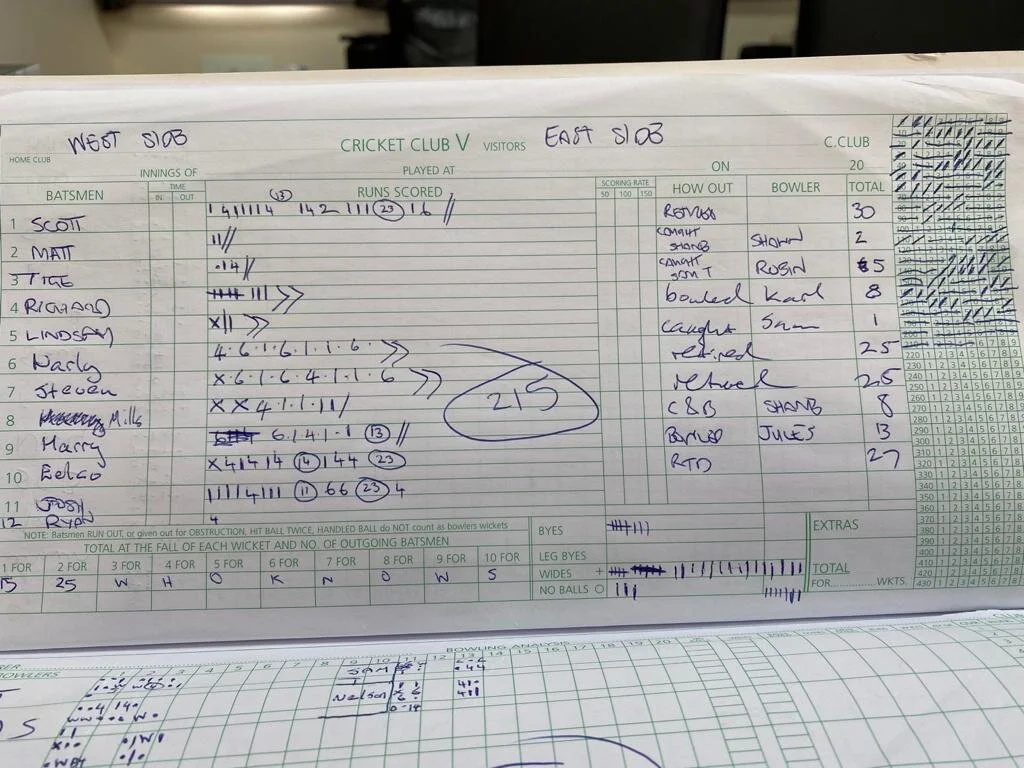 Josh played a great (and somewhat violent) closing innings of 27, leaving Ryan to score 4 from his solitary ball - the West finishing with a competitive 215.