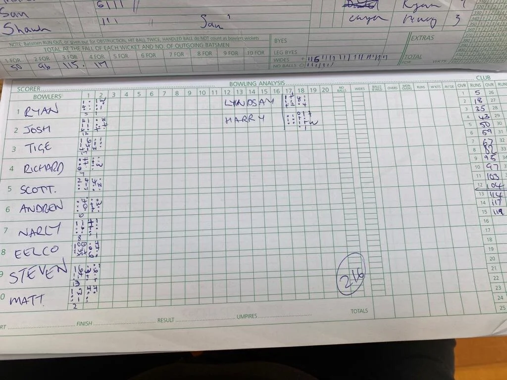 After 12 overs the West had posted 98. Narly came in and accelerated the innings with a 25*. The West then unleashed the African trifecta. Steve powered to 25* after being out for 0 and Mills stuttered his way to 8 after 2 outs on 0. Harry came in a looked very assured before being bowed by Jules. Eelco was another that was out on 0 but then put in a PB batting performance of 23 not out.