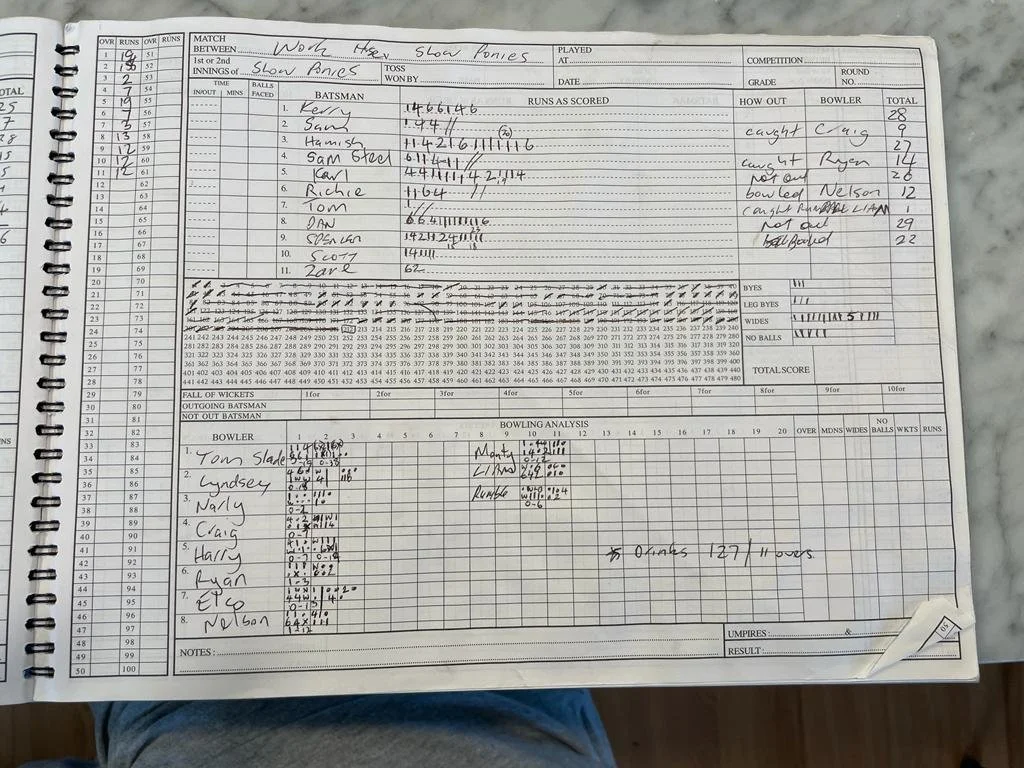 At some point during the captains knock, a heavily intoxicated Tom Slade turned up from the cricket net side of the ground. After a quick pep talk to remind Tom how to hold the bat, Narly and Tom faced the last 2 overs with Narly farming the strike as much as he could, finishing not out on 5, and Tom not out on 0.