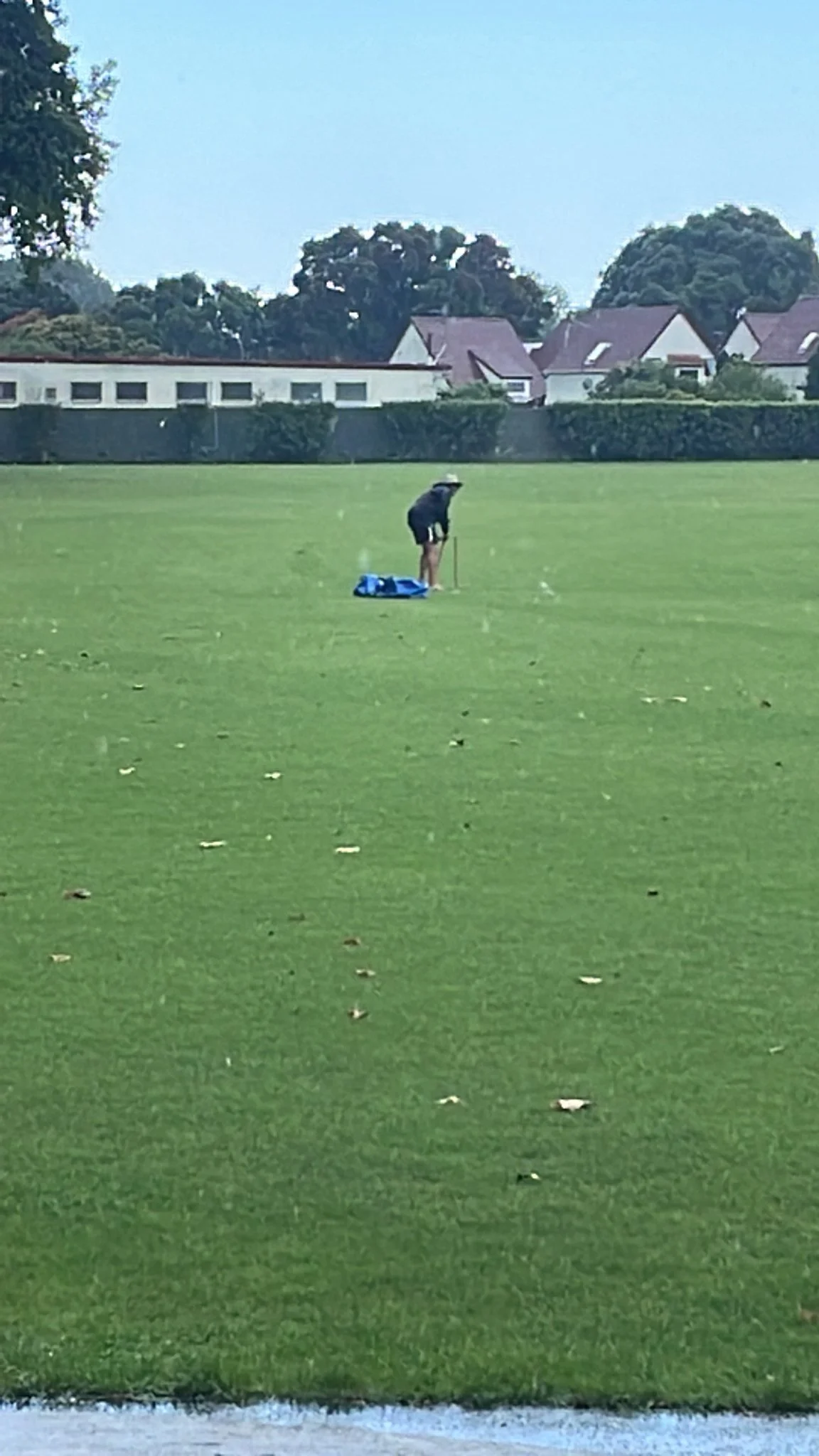 The third act of BDT VII started with said rain event still in progress and the BDT squads sheltering under the club, competing for space with Craig’s detachable portable kitchen. As the rain turned to drizzle the pitch and field were marked up but there was still no sign of the swim club members Zane and Tom. Zane arrived eventually (and thankfully intact) on his bicycle and soon after the toss was held, won by Craig who elected to bat. The traditional team photo was taken, but Tom Slade was still nowhere to be seen.